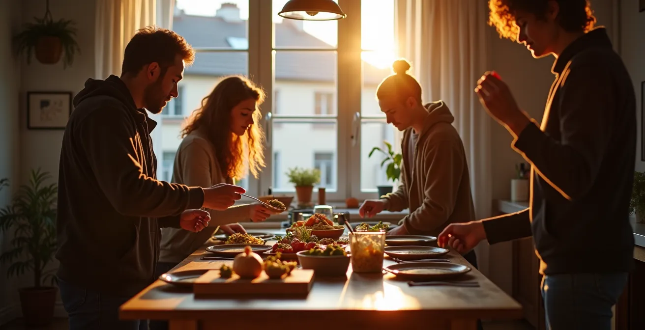 Gerichte wie „Schwäbische Linsen mit Spätzle“, der rheinländische Klassiker „Himmel un Ääd“ (Himmel und Erde, aus Äpfeln und Kartoffeln) oder die ostdeutsche Spezialität „Tote Oma“ (gebratene Blutwurst) sind perfekte Beispiele. Sie basieren auf günstigen Grundzutaten, die du komplett beim Discounter bekommst. Eine Portion dieser Seelentröster kostet oft weniger als 3 Euro und ist authentischer als jedes Schnitzel im Touristen-Restaurant. Das gemeinsame Kochen und Essen dieser Gerichte in deiner WG ist zudem ein perfekter sozialer Eisbrecher.